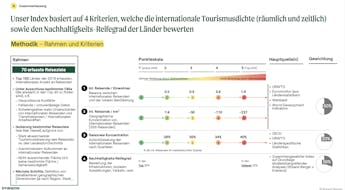- Der Index wurde auf der Grundlage externer Daten erstellt (basierend auf einer Auswahl von 70 der 100 wichtigsten Reiseziele weltweit) und soll den Akteuren der Tourismusbranche als Entscheidungshilfe dienen.